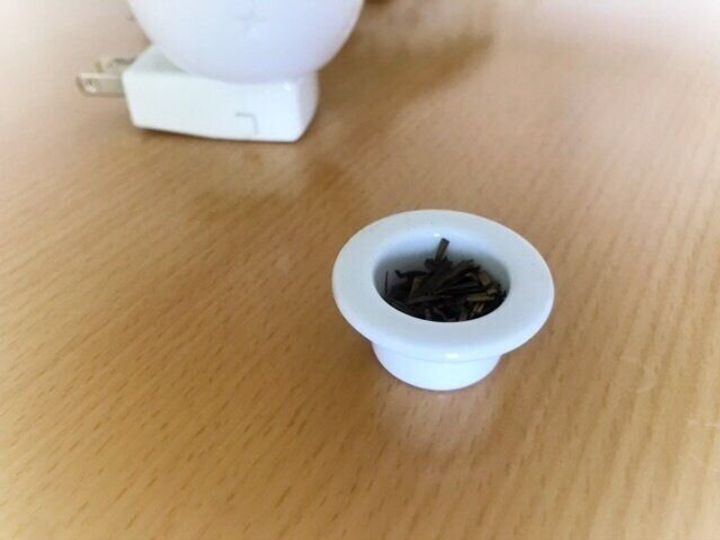 オイル用の上皿が非常に小さく、茶葉の香りも立ちにくいと思われますが、本格的な香炉を買う前に持っている物を活用!スイッチをオンにしてしばらく待つと、ほのかにお茶の香りがしてきます。