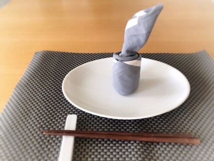手拭いをテーブルナプキンの替わりに使えば、和食にも合うスタイリングになります。親しみやすく、温かみのある雰囲気になりますね。写真では「キャンドル(またはナイトライト)」という形にしましたが、四角く畳むだけでも十分です。手拭いが長すぎると感じるなら、2〜3等分に切ると扱いやすくなります。