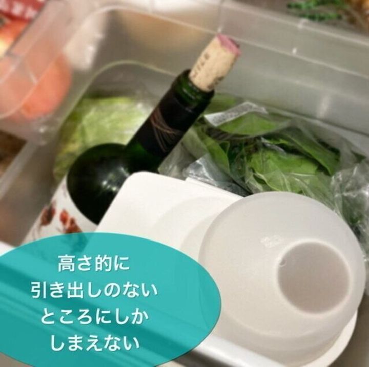高さがあり、わが家の野菜室だと、庫内の引き出しが引っかからない部分にしか入りません。