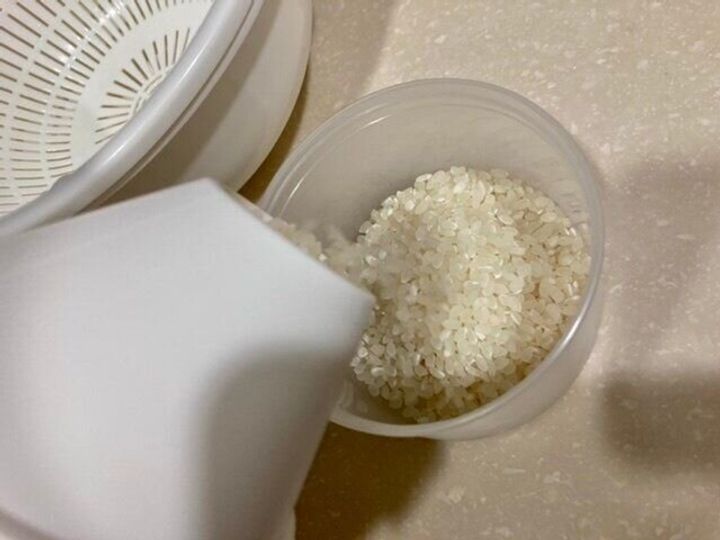 容器いっぱいお米を入れました。この時点で、片手で持ち上げるのはやや困難なような?