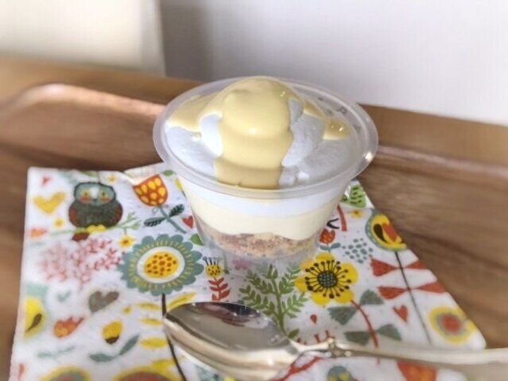 「とろける生チーズケーキ」は、下から砕いたクッキー生地、カスタード入りクリームチーズ、チーズホイップクリーム。その上からチーズソースがたっぷりと乗せられていています。