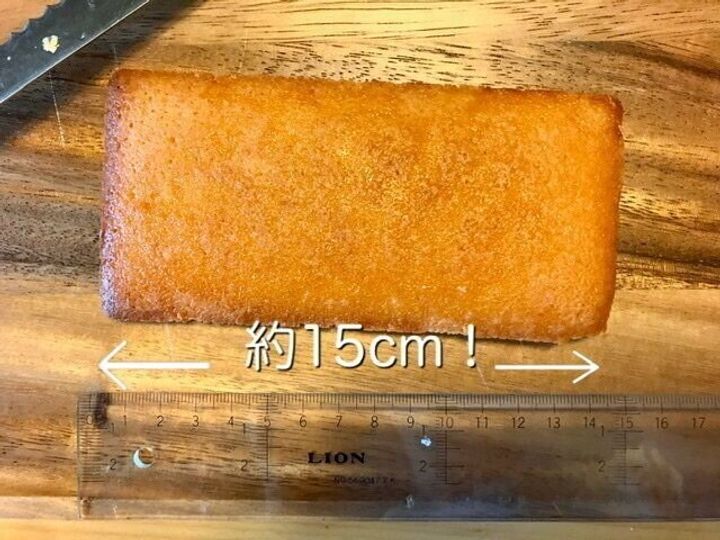 フィナンシェ自体も、横の長さ約15cmとやっぱり巨大です。指、15cmに広げてみてください。大きさが伝わるでしょうか?「フィナンシェ」はフランス語で「お金持ち」の意。間違いなく大富豪級サイズ。