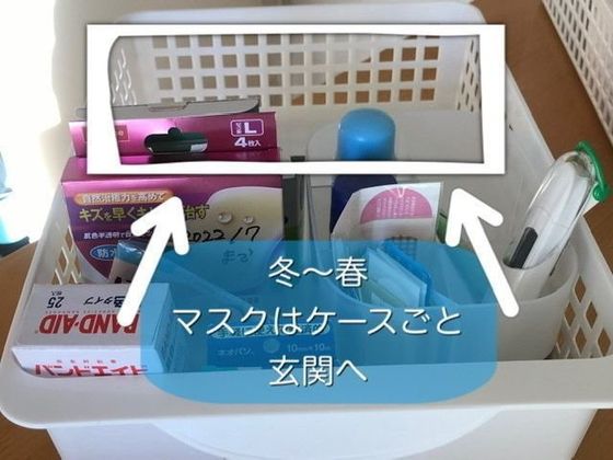 マスクを多用する季節は、無印のボックスごと玄関へ移動。ボックスを抜いて場所が空いても、シーズン後に戻せるよう、何も入れません。