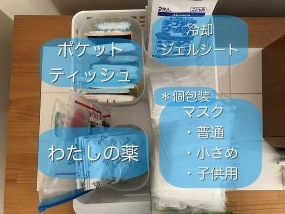 手前右が個包装のマスク。手前から子供用・小さめ・普通サイズと、大きめの付箋で区切りをつけています。左がわたしの薬。自分だけが使うものなので、下段の端に置いています。奥に冷感ジェルシートと、ポケットティッシュ。