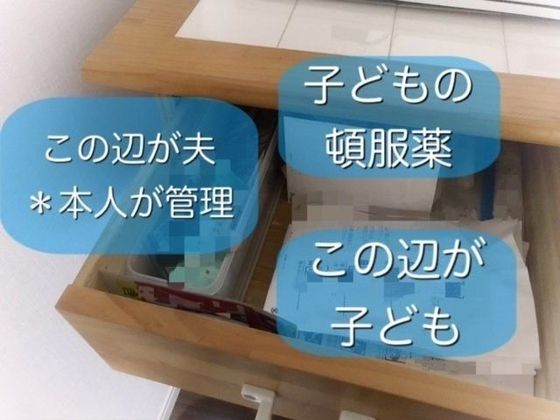 夫の薬は、スペースから大きくはみ出なければ、基本的にノータッチ。本人が使いやすければ、それでいいです。