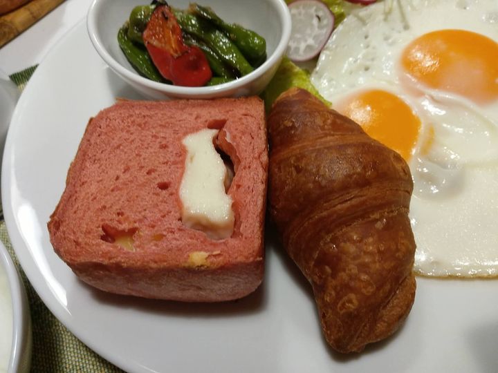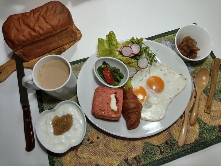 『マキ屋フーズ』の紅麹パン朝食セット。