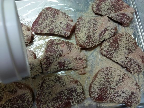 ビニール袋に入れて粉をまぶす方法もあるけど、どうしてもムラができちゃうから好きじゃないのよね。