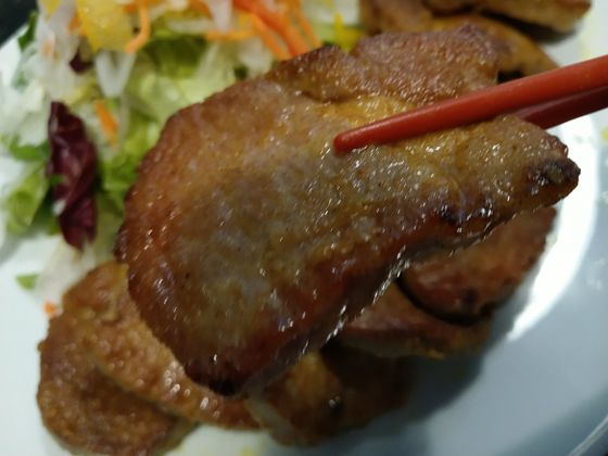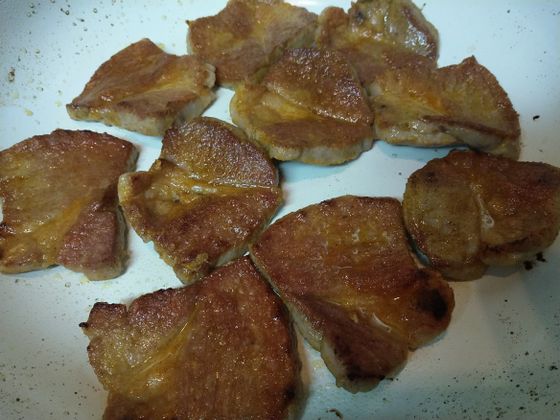 粉をふった塩豚を、油をひいたフライパンで両面をカリッとするまで焼きます。