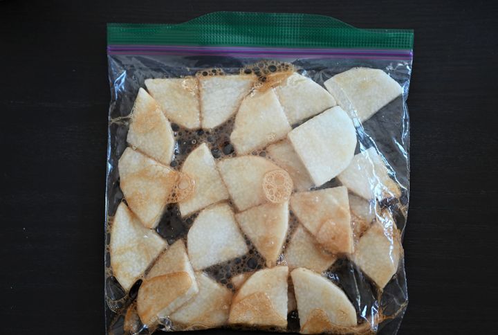 (2)保存袋に長芋とめんつゆを入れて軽くもみ、