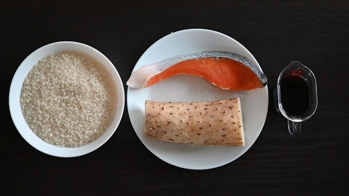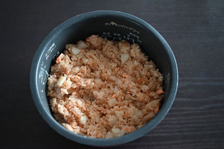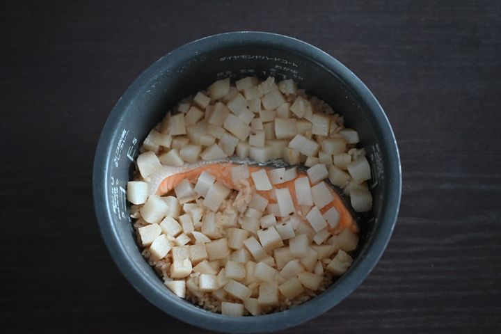 長芋と鮭をのせて通常炊飯する。