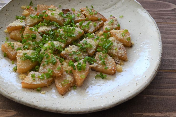 めんつゆで漬けた長芋を焼いて粉チーズをかけるひと品。