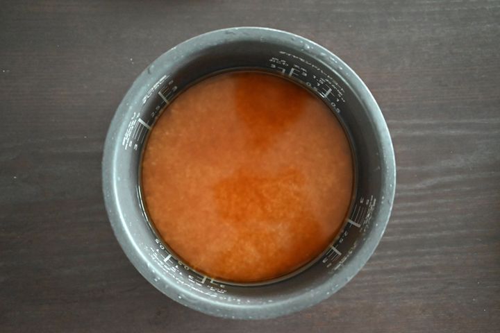 (2)米を研ぎ、めんつゆを加え、炊飯器のメモリまで水を加える。