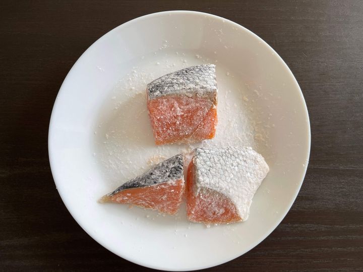 (1)鮭をキッチンペーパーで水気をふき取る。