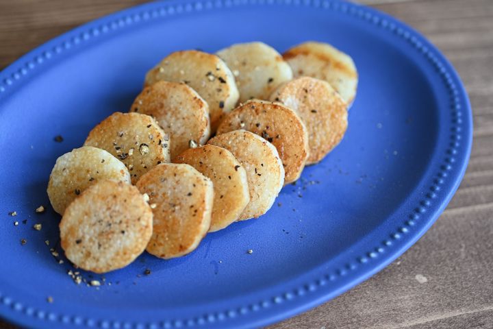 (2)フライパンにバターを加えて熱し、長芋に焼き色がつくまで両面焼く。