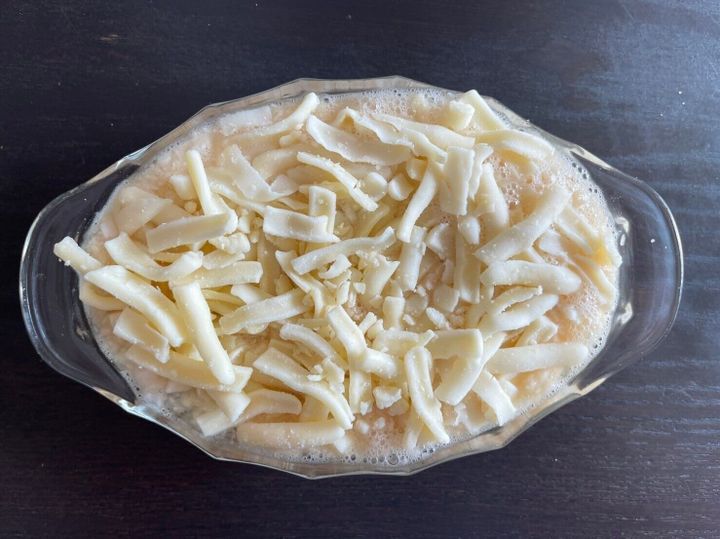 (5)魚焼きグリルやトースターでチーズに焼き色がつくまで加熱し、卵黄をのせて完成。