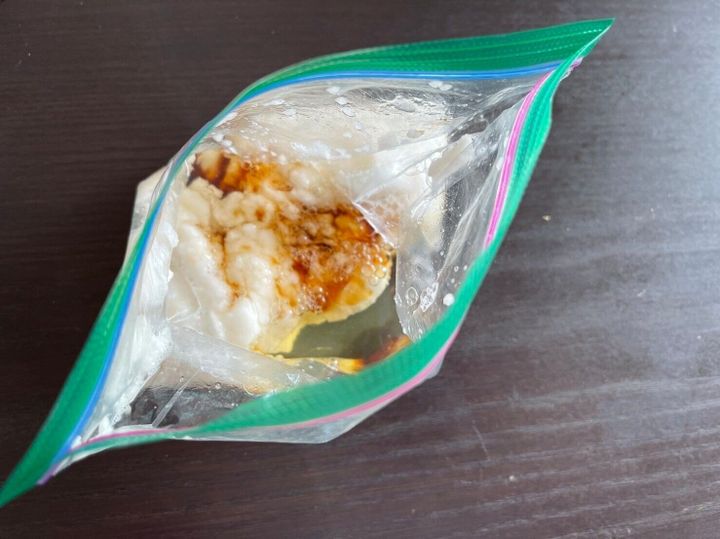 (3)(2)にめんつゆ、卵白を入れて袋の上から混ざるように揉みこむ。