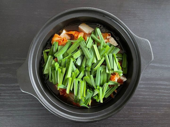 水を具材の2/3程度の高さまで入れ、上からニラをのせる。