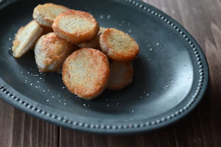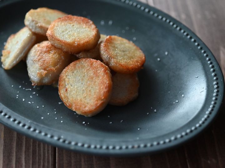 (2)フライパンに薄切りにしたにんにくとオリーブオイルを加えて弱火にかけ、香りがでてきたら里芋を入れて中火にする。上下がカリっとするまで加熱して完成。