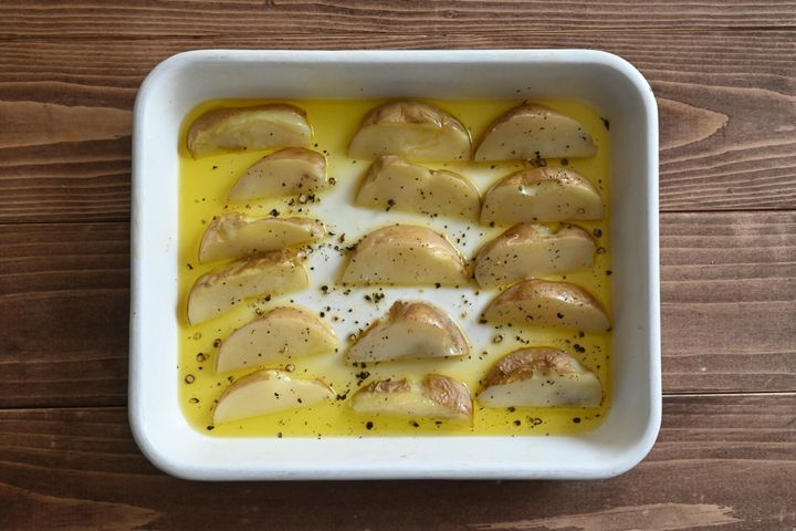(3)耐熱容器に並べ入れ、オリーブオイルを全体にかけて塩、ブラックペッパーをかける。