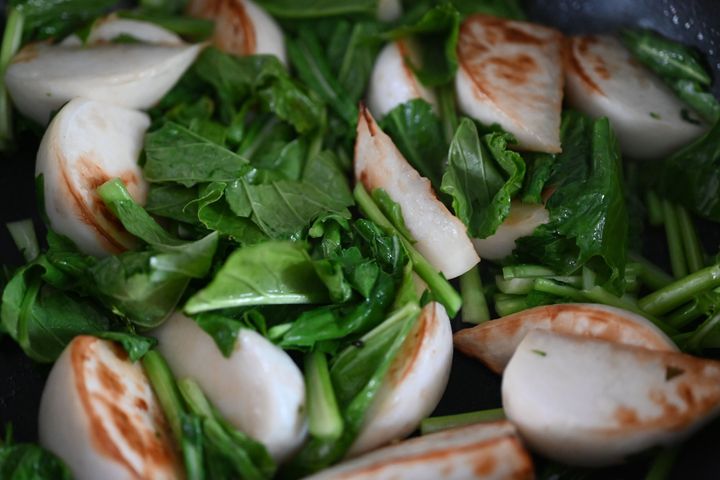 (3)かぶの葉を加えてしんなりするまで加熱する。