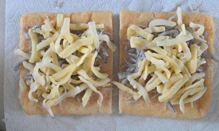 (1)油揚げを半分に切り、しらす、ピザ用チーズを半量ずつのせる。