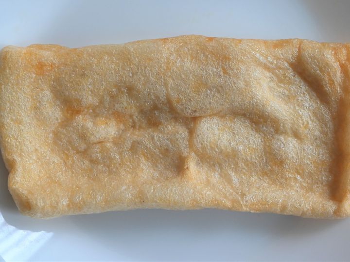 (2)油揚げはフライパンに入れて中火にかけ、カリカリになるまで加熱する。