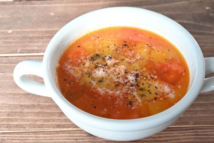 (4)パプリカがやわらかくなってきたら水400mlを加えて沸騰するまで加熱し、塩で調味する。