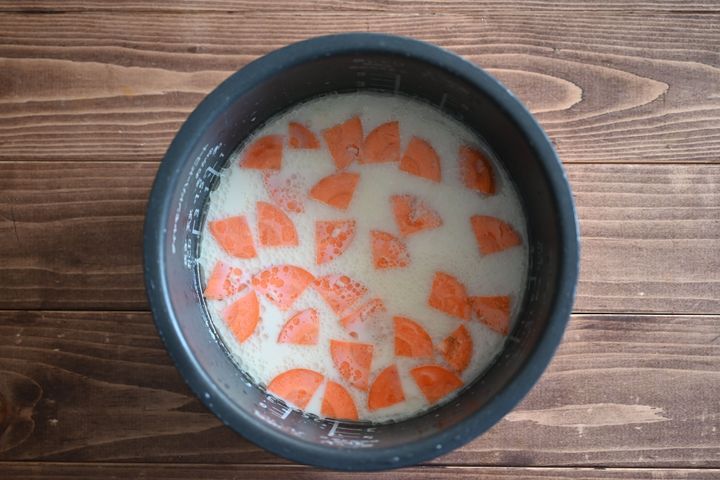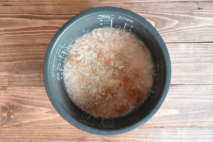 (2)米を研ぎ、白だしを加えて、炊飯器のメモリまで水を入れる。