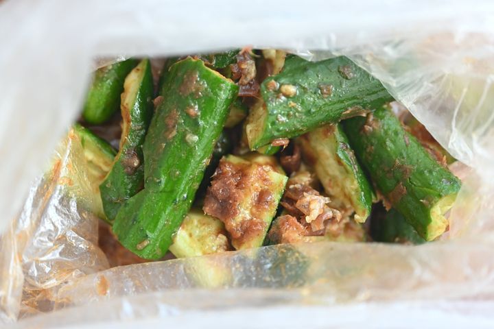 (1)きゅうりを食品用ポリ袋に入れ、めん棒で食べやすい大きさに叩き割る。