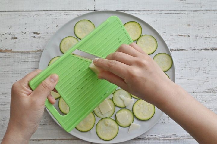 ’(1)ズッキーニとチーズをスライサーで薄切りにする。