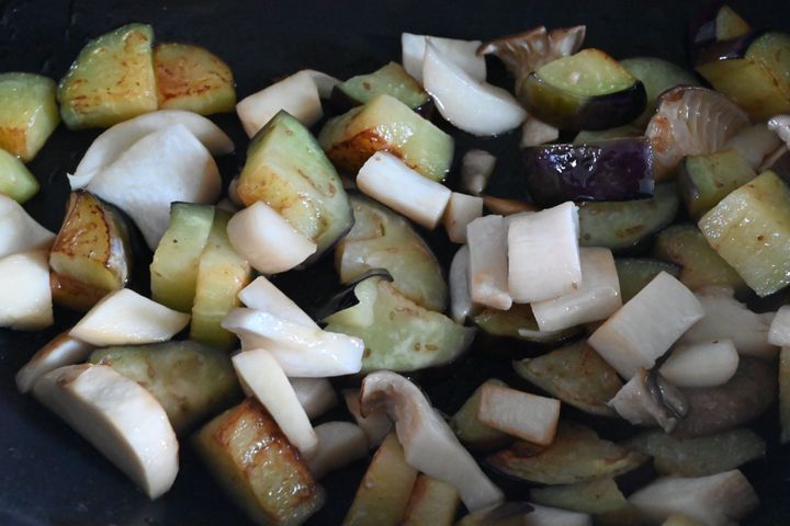 乱切りにしたなすをオイルをしっかり吸うまで炒める。