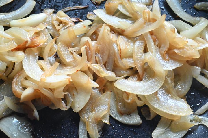 (4)香りが出てきたら玉ねぎを入れて弱めの中火にし、5分炒める。