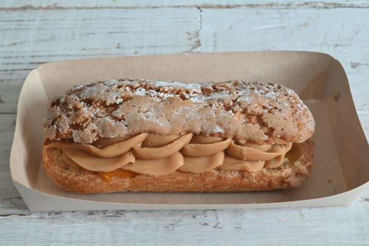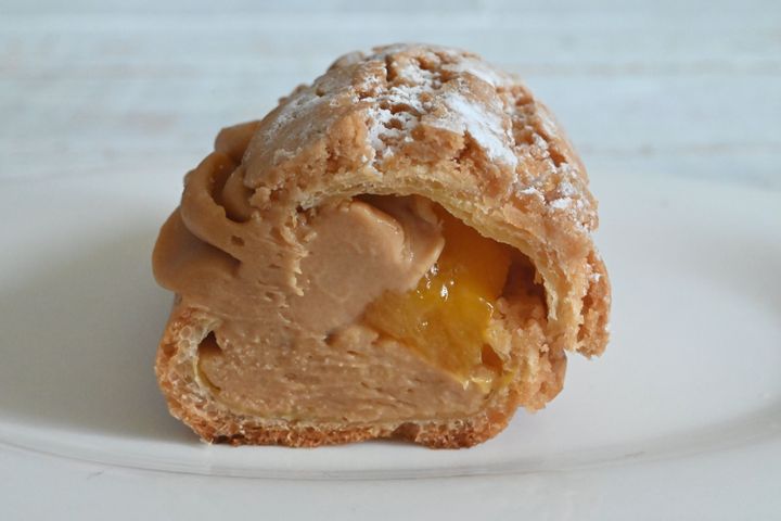 歯切れの良いエクレア皮に、甘酸っぱいマンゴーの果肉とソース、ほろ苦いキャラメルクリームが詰まっています。