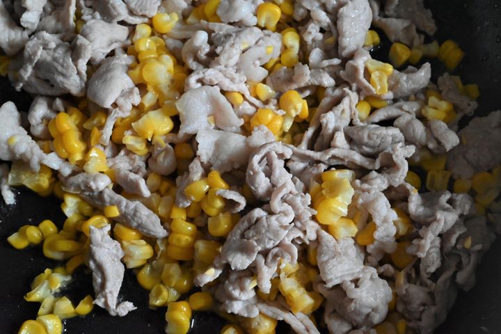とうもろこしと家計にやさしい豚小間切れ肉を使う