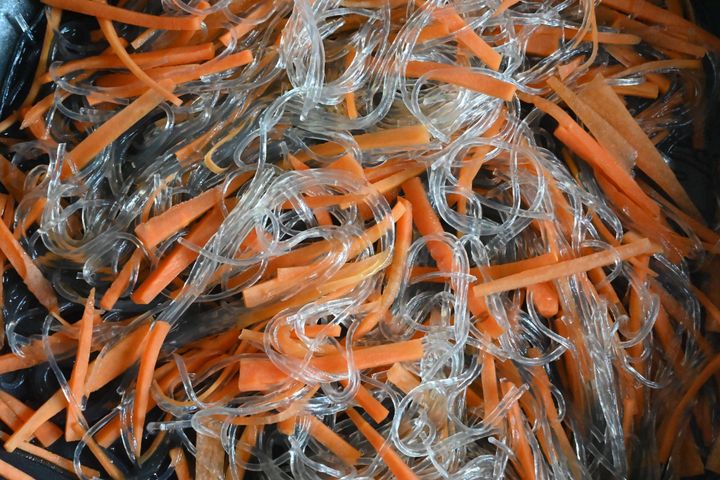 にんじんと緑豆春雨を入れて緑豆春雨がやわらかくなるまで混ぜながら加熱して取り出す。