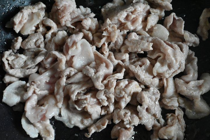 (4)フライパンにごま油を入れて熱し、豚肉の色が変わるまで炒める。