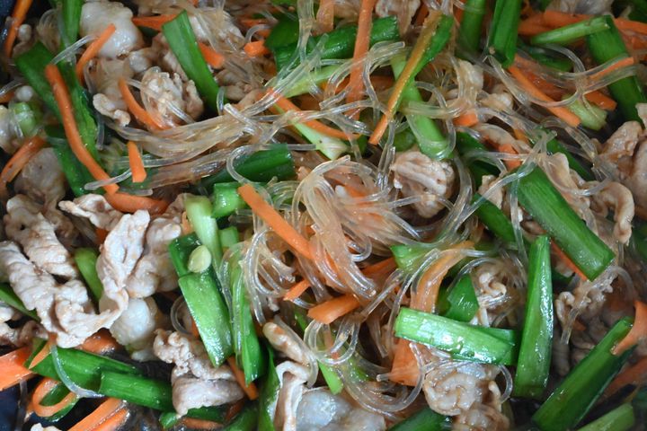 (5)緑豆春雨、にんじん、にら、焼肉のたれを入れて全体を炒め合わせて完成。