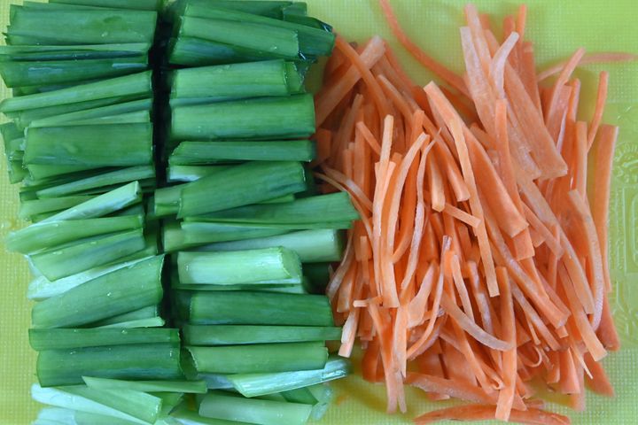(2)にんじんを細切り、にらは3cm程度に長さに切る。