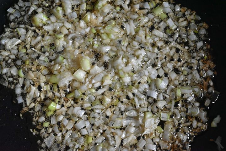 (1)長ねぎ、にんにくを粗みじん切りにする。