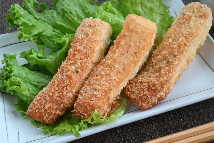 (2)パン粉と粉チーズを混ぜ合わせ、(1)につける。