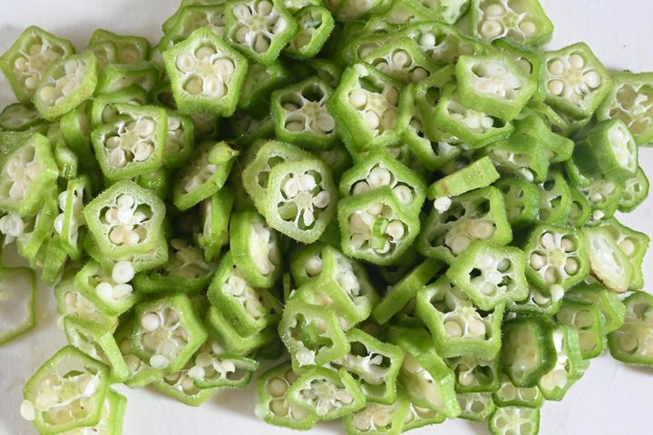(2)オクラは塩で板ずりし、ヘタを切り落として薄切りにする。