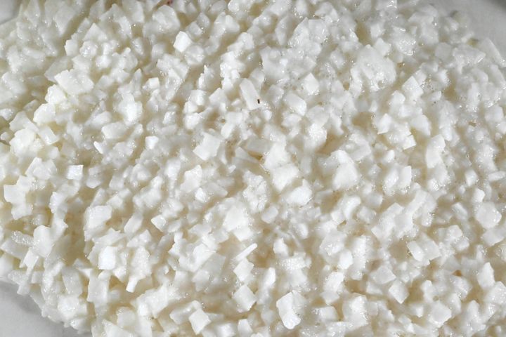 (3)長芋は皮を剥いて粗めのみじん切りにする。