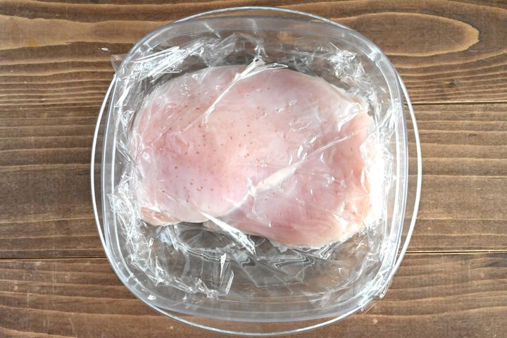 耐熱容器にむね肉と酒を加えて、ラップを落とし蓋のようにしてのせる。