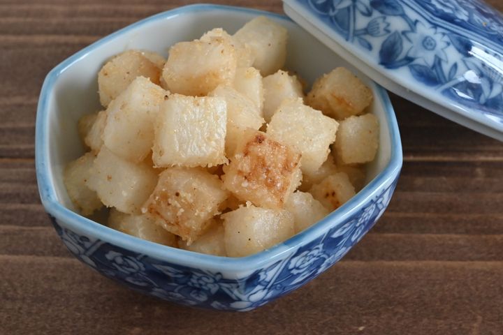 (2)フライパンにごま油を入れて中火にかけ大根に焼き色がつくまで炒める。