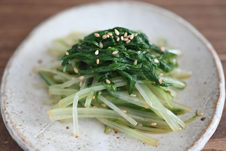 (3)水気をしっかり絞り、めんつゆ、白ごま、ごま油を加えて混ぜて完成。