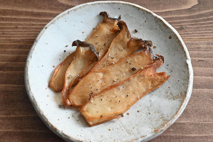 (3)エリンギがカリッとするまで両面しっかり焼いて皿に盛り、塩をかけて完成。