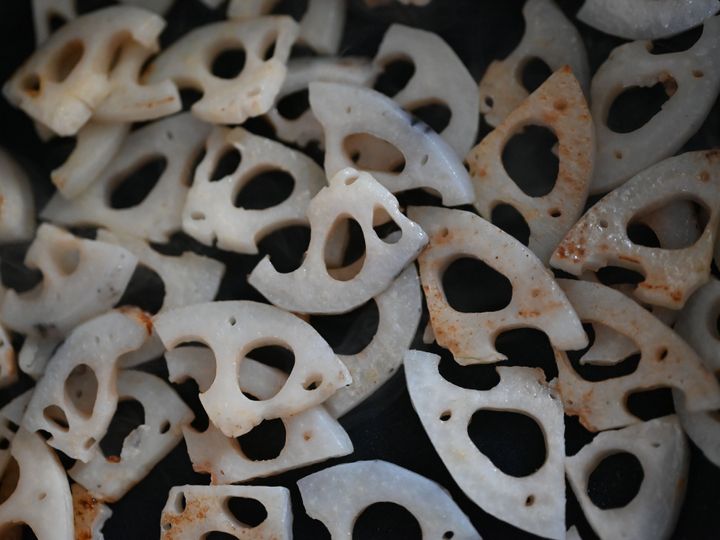 (2)フライパンにごま油を加えて中火にかけ、れんこんに焼き色がつくまで加熱する。