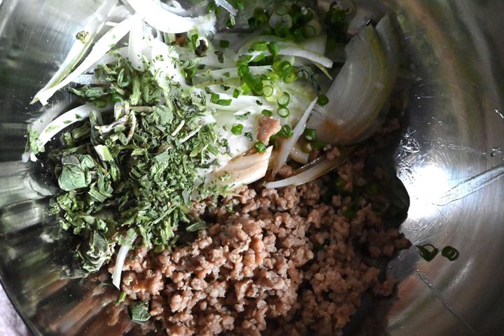 (3)ラープソース、かやくを豚ひき肉合わせてよく混ぜる。