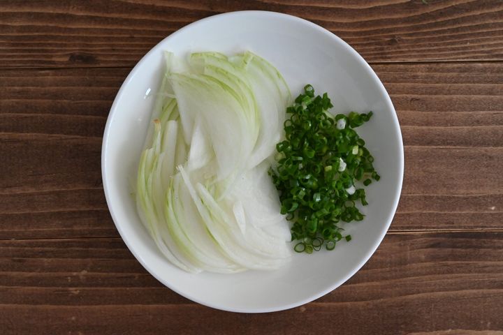 (1)玉ねぎは薄切りに、小ねぎは小口切りにする。