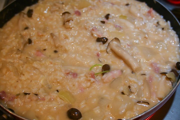 (1)フライパンにオリーブオイルを加え、米、しめじ、玉ねぎ、パンチェッタを炒めます。